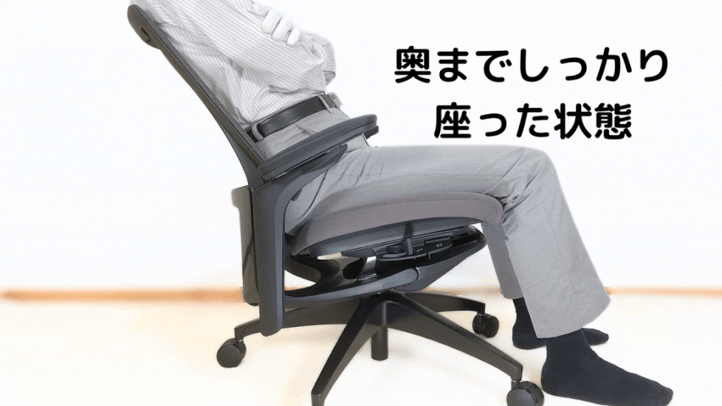 実際、デフォルトの状態(最も背もたれが立っている状態)で座ると、かなりしゃきっとした姿勢になります。